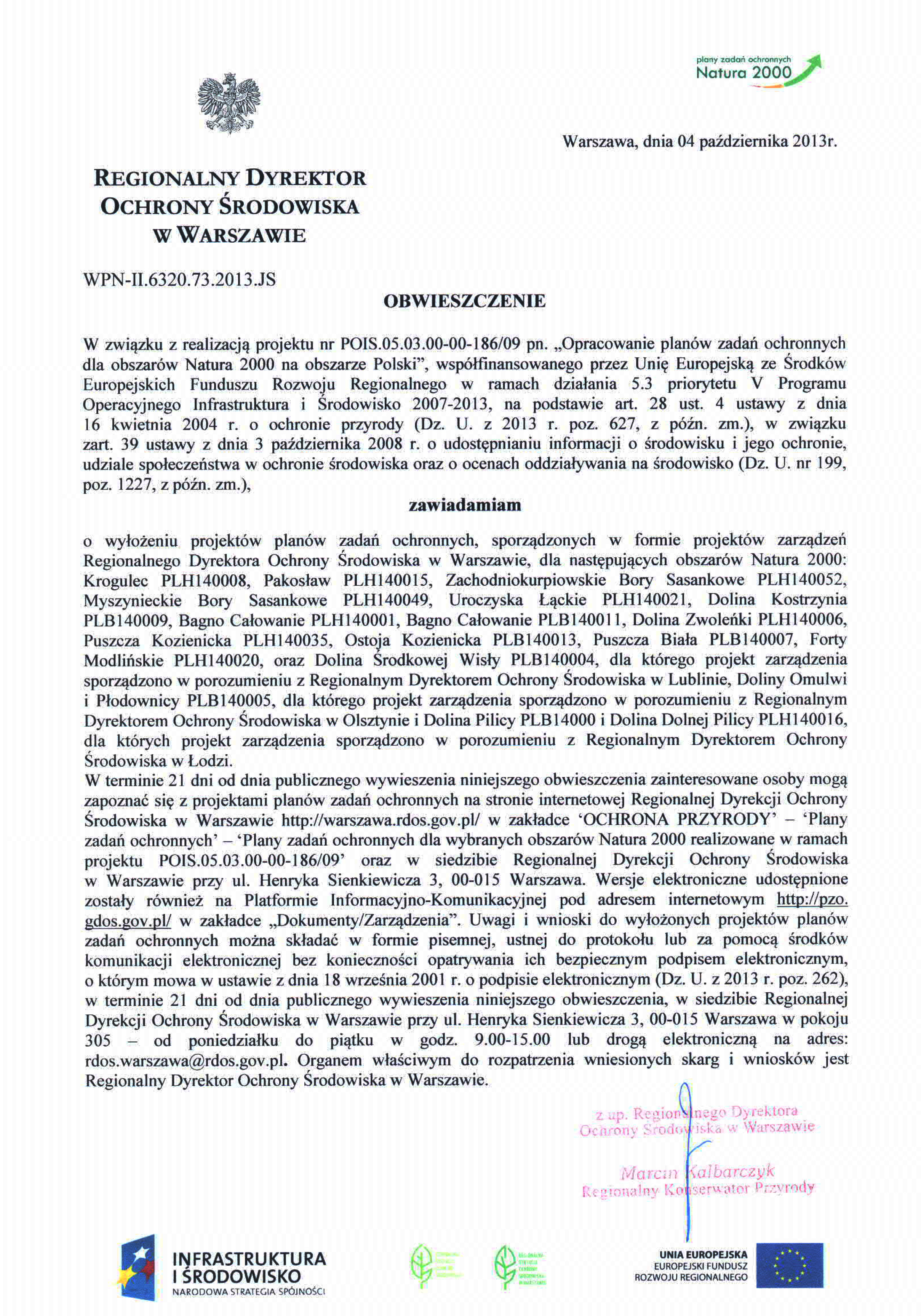 | Obwieszczenie w związku z realizacją projektu POIS.05.03.00-00-186/09 pn. "Opracowanie planów zadań ochronnych dla obszarów Natura 2000 na obszarze Polski" |